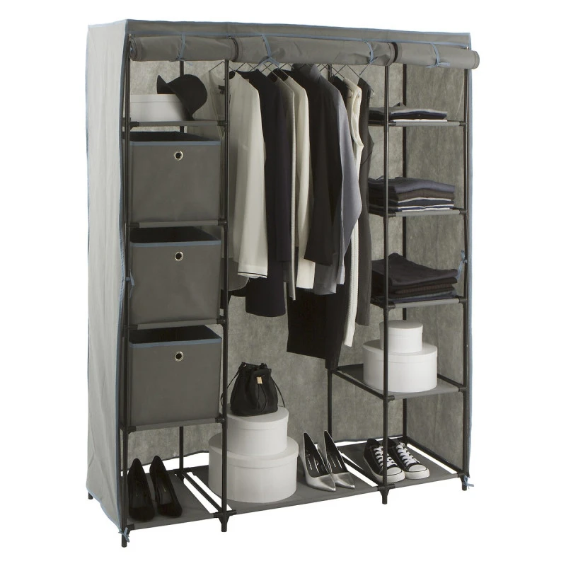 Indispensable dans un appartement ou un studio, cette armoire en tissu grise composée d’une penderie et de 11 étagères (dont 3 boîtes) offrira un rangement d’appoint bienvenu et extrêmement bien conçu.