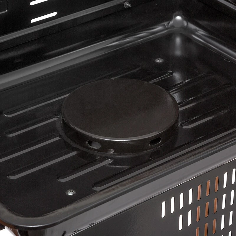 Il offrira tous les avantages que peut vous donner un barbecue à charbon ! Il comprend une cuve rectangulaire et une desserte en bois destiné aux aliments et aux accessoires.