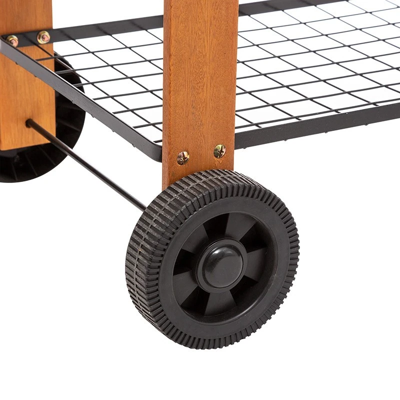 Plateforme de rangement et étagères latérales en position basse pour y disposer le maximum d’objets. Deux grandes roues facilitent les déplacements dans le jardin.