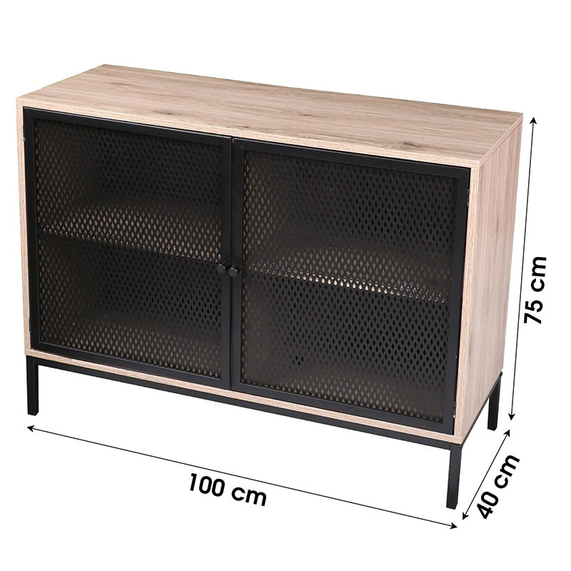 Buffet en métal et imitation bois de hauteur 75 cm. Ce buffet est composé de deux portes effet grillage avec étagère intérieure. Idéal pour ranger votre vaisselle par exemple.