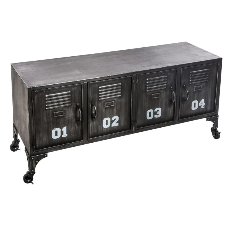 Meuble Sevin de marque Atmosphera. La tendance est aux meubles en métal qui décorent tout en offrant des espaces de rangement. Assorti au meuble 6 portes Sevin. Meuble sur roulettes, type casier, 4 portes numérotées. A monter soi-même.