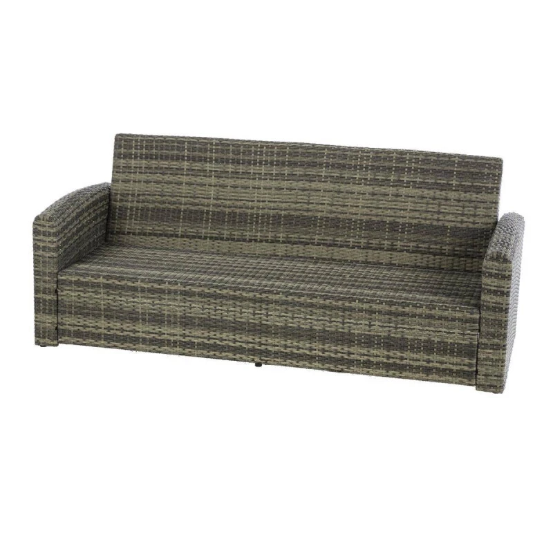 Ce canapé est conçu spécialement pour l’extérieur : sa structure est en aluminium traité époxy antirouille, son habillage est en résine synthétique tressée et ses coussins sont en polyester 180 g/m² traités déperlant et déhoussables.