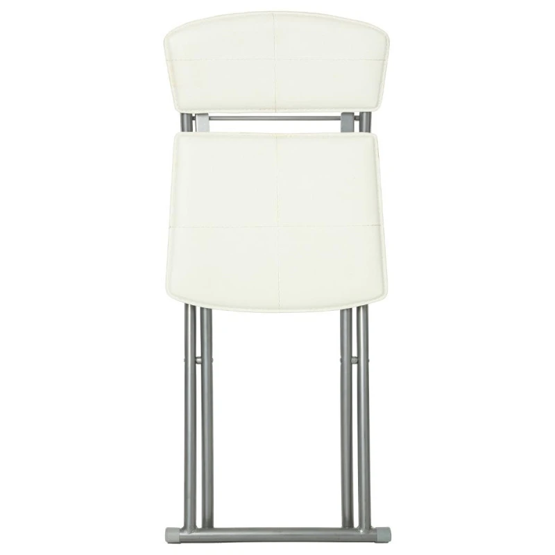 Chaise design et pratique car elle se plie entre 2 utilisations. Structure en acier. Assise en panneaux de fibres de bois recouvert de tissu synthétique pvc, solide et facile d’entretien