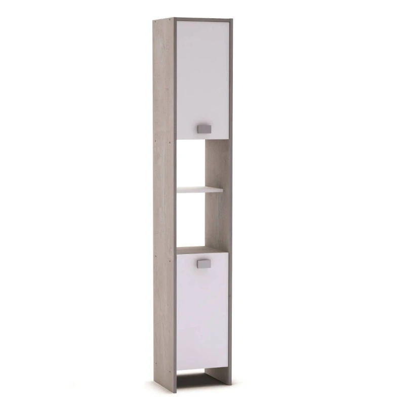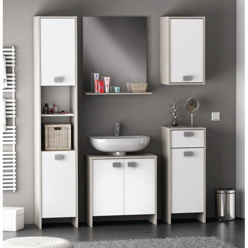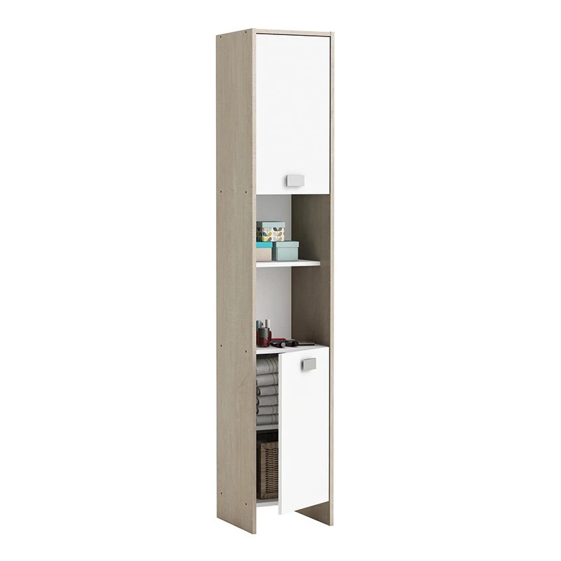 La colonne Honolulu en bois blanc et chêne champagne 2 portes 2 niches saura vous séduire grâce à sa faible prise de place au sol tout en proposant un large rangement. Idéal pour les petits espaces cherchant à pouvoir ranger le maximum de produits en un minium de place, elle alliera, de plus, sa praticité à son élégance. En effet, ses coloris très modernes permettront une adaptation rapide à de nombreuses salles de bain. Chaque porte cache une étagère intérieure afin de diviser le volume en deux et stocker ainsi plus de produits. L’ensemble de la collection vous est proposée en accessoires pour pouvoir compléter votre gamme selon vos envies ! A monter soi-même, notice incluse.