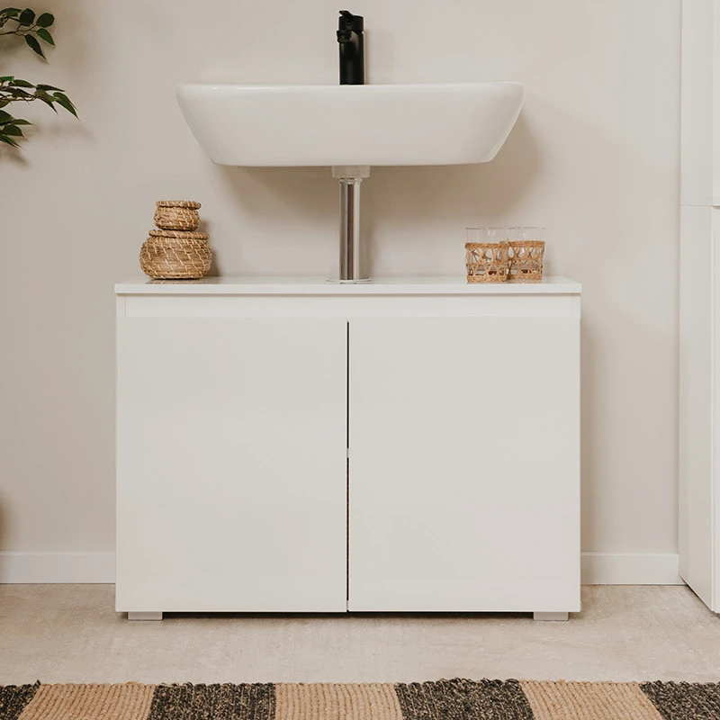 Avec sa finition blanc brillant et ses lignes épurées, le meuble se fondra facilement dans n’importe quel style de salle de bain.
