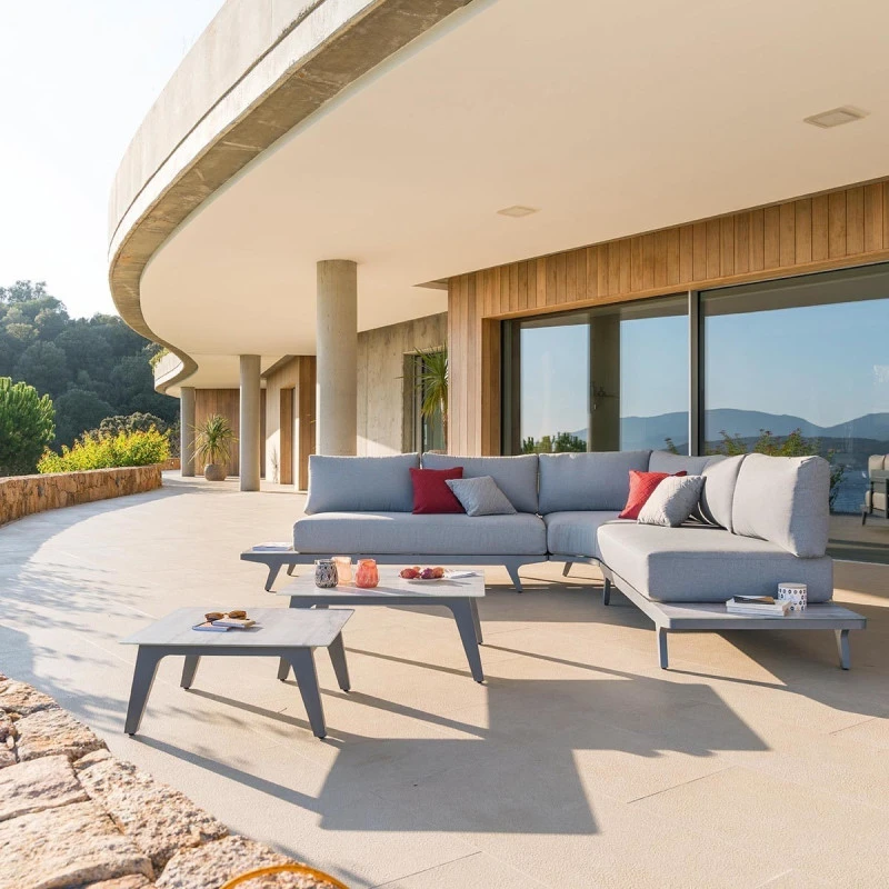 Salon de jardin 7 places angle Pulpy de la marque Hespéride. Optez pour la gamme Premium de chez Hespéride, le haut de gamme à domicile. Ce salon coloris gris quartz comprend :