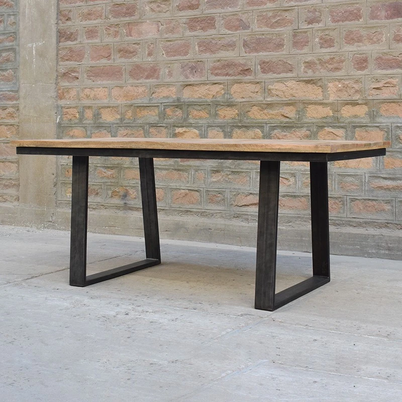 Découvrez la table de salle à manger avec plateau en bois massif de manguier et piétement en métal noir.