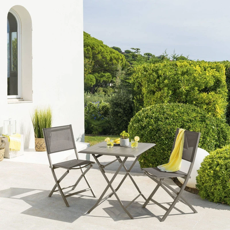 Parfaite pour des repas en tête à tête, découvrez la table en aluminium 2 places Azua en coloris tonka de la marque Hespéride.