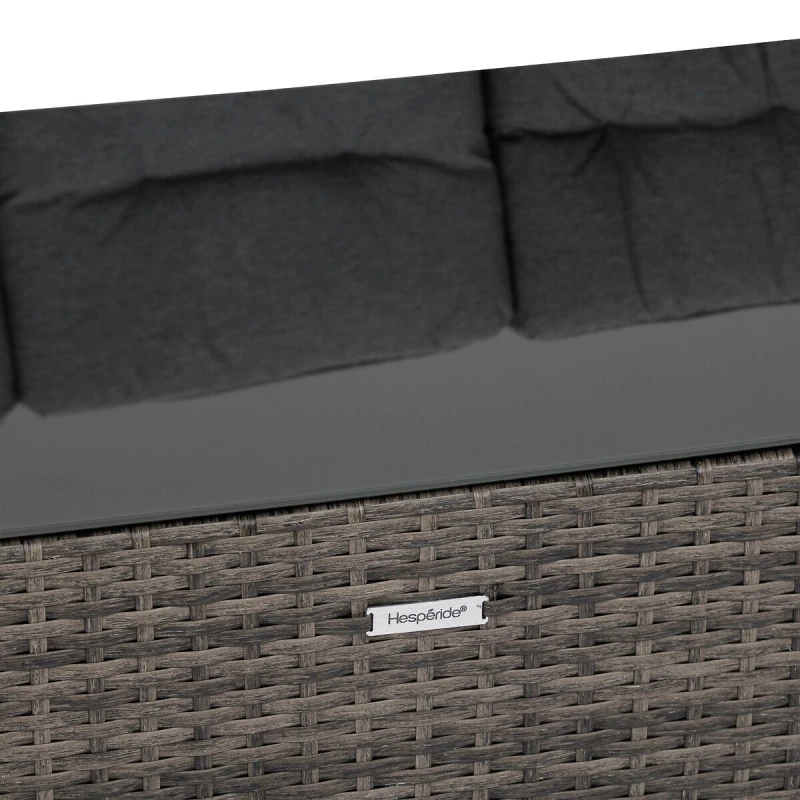 Conçue pour durer, la table dispose d’une structure en aluminium traité époxy antirouille, d’un habillage en résine tressée synthétique et d’un plateau en verre trempé.