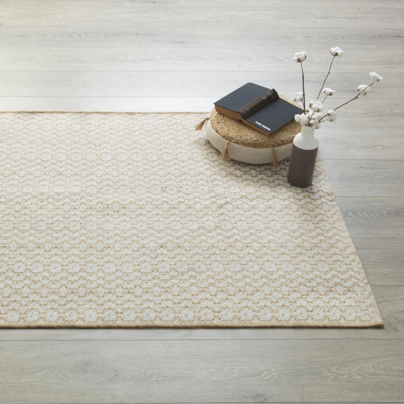 Tapis rectangulaire 120x170cm en jute et coton. Ce tapis naturel et blanc sera idéal pour créer une ambiance cosy et tendance.