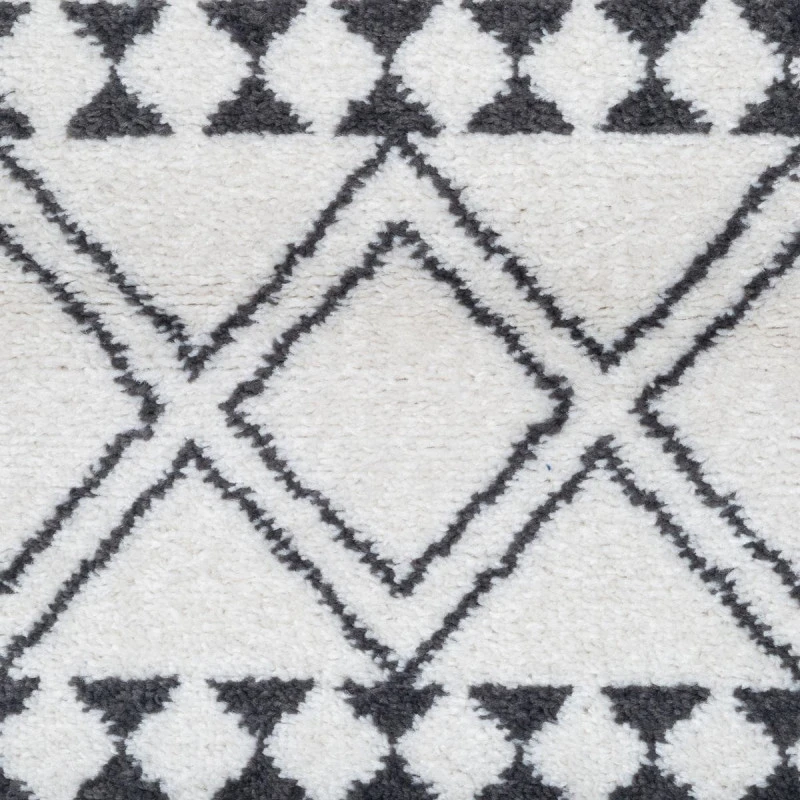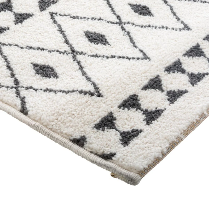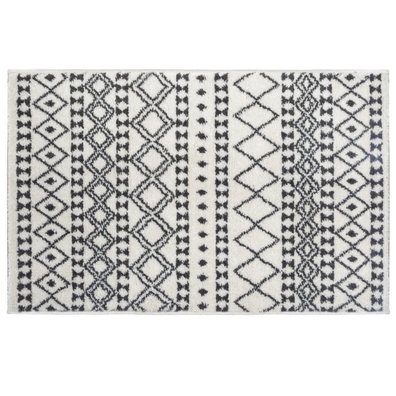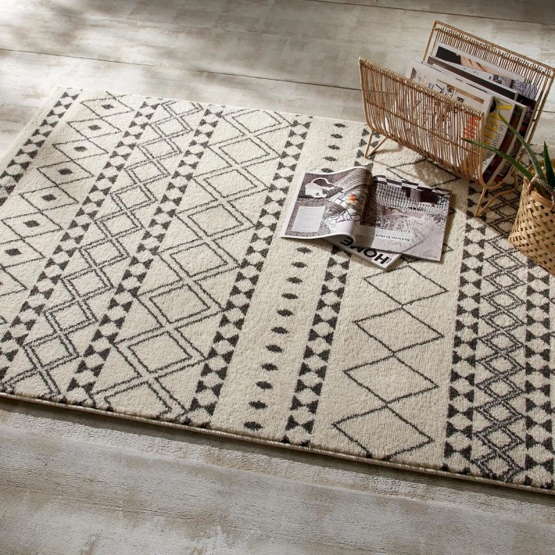 Tapis blanc et gris foncé avec motifs ethniques de la marque Atmosphera. Apportez une touche bohème à votre intérieur avec ce tapis motifs ethniques.