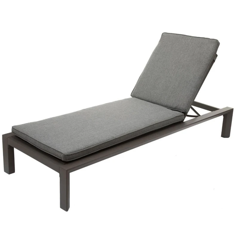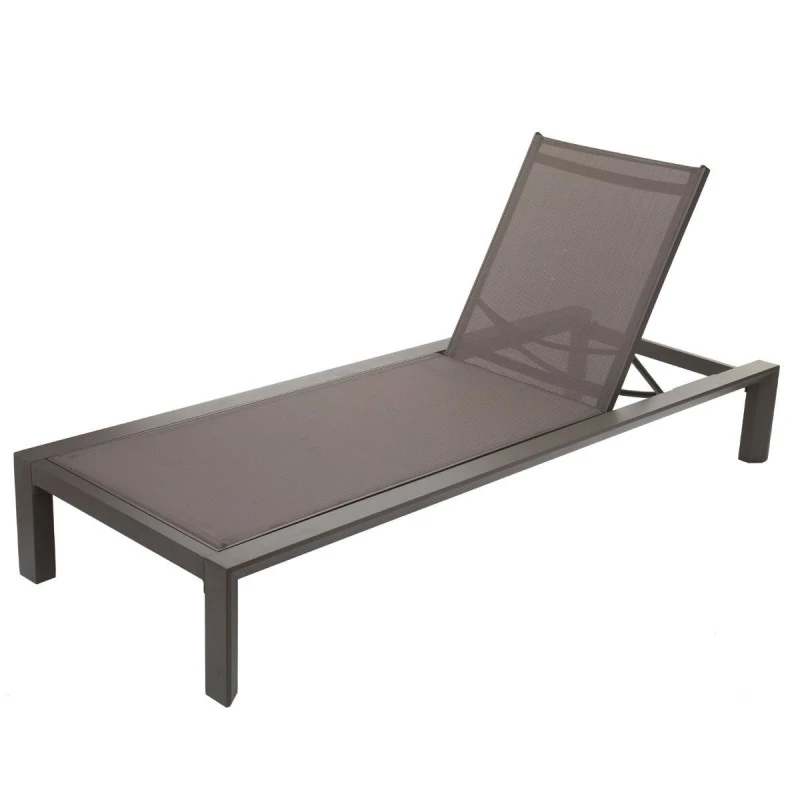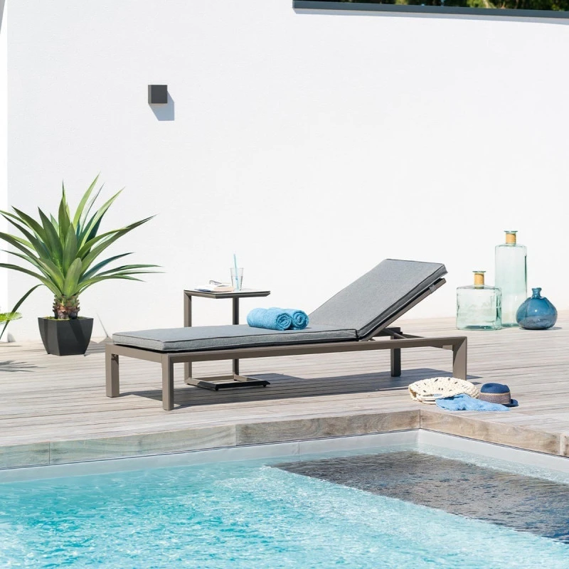 Une création Hespéride, le transat Evasion structure en aluminium tonka et coussin wengé inclus.